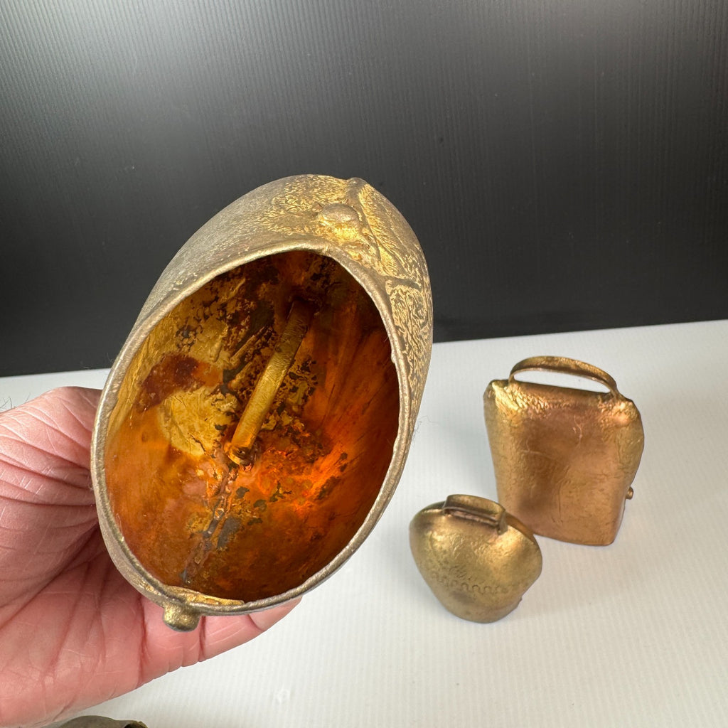 This vintage lot of 5 Swiss and West Germany brass cowbells is perfect for any occasion, with a multicolor design suitable for door decor or other areas of the home. Made of brass and featuring a farm animal theme, these original cow bells are a unique addition to any room. Easy to clean with a damp cloth, they come unboxed and with a buckle closure type for easy hanging. Ideal for adults who appreciate decorative collectibles, these cowbells add a touch of charm and nostalgia to any space.