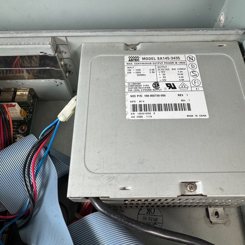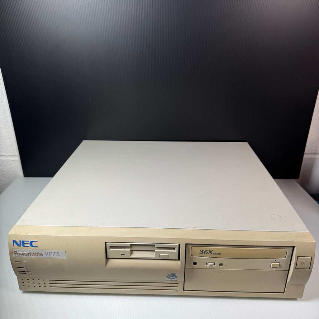 This listing is for a vintage NEC PowerMate VP75 desktop computer—an early-to-mid-1990s business-class PC known for its reliability and clean industrial design. The system includes its original beige case, front-mounted 3.5" floppy drive, and a 36X max CD-ROM drive, as shown in the photos.