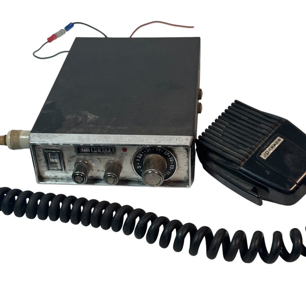 This vintage Pace CB143 CB radio is a classic base station model featuring a sturdy black metal chassis with a chrome front panel. It includes a rotary channel selector knob with 40 channels marked clearly, two control knobs for volume and squelch, and a meter gauge for signal strength or power output. The unit is equipped with a coiled microphone cable connected to a black Pace branded microphone, designed for reliable communication.
