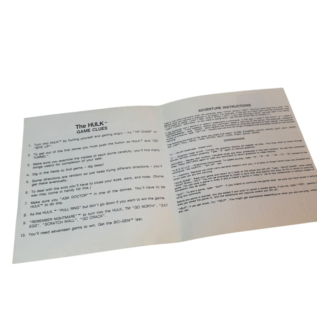 Experience the classic 1985 adventure with The Hulk Questprobe for Apple II, a unique video game that brings the Marvel Comics character to life. This vintage game allows you to control both Bruce Banner's intellect and the powerful Hulk as you explore mysterious lands, solve puzzles, and face dangerous creatures. Developed by Scott Adams and published by Green Valley Publishing, this edition features engaging interactive graphics and a compelling storyline where your ultimate goal is to unlock the riddle of the Chief Examiner and survive.