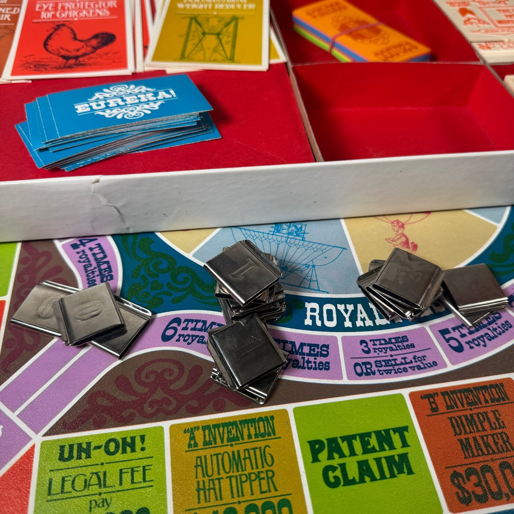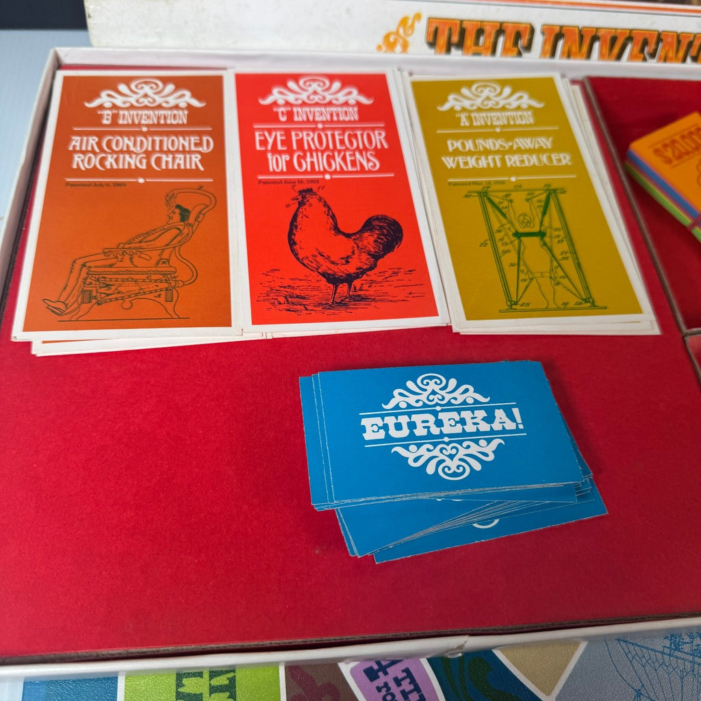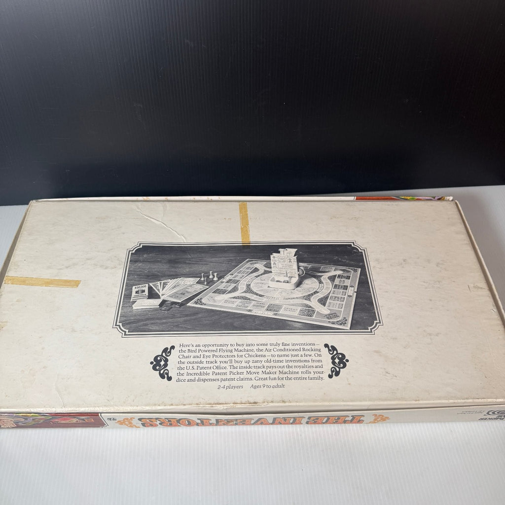 The Inventors is a vintage board game by Parker Brothers, themed around crazy inventions and the patent process. Designed for 2-4 players ages 9 and up, this classic game combines strategy and luck as players buy and sell zany old-time inventions like the Air Conditioned Rocking Chair, Eye Protector for Chickens, and Pounds-Away Weight Reducer. The game board features colorful, detailed artwork depicting various inventions and patent claims, creating an engaging and humorous experience.