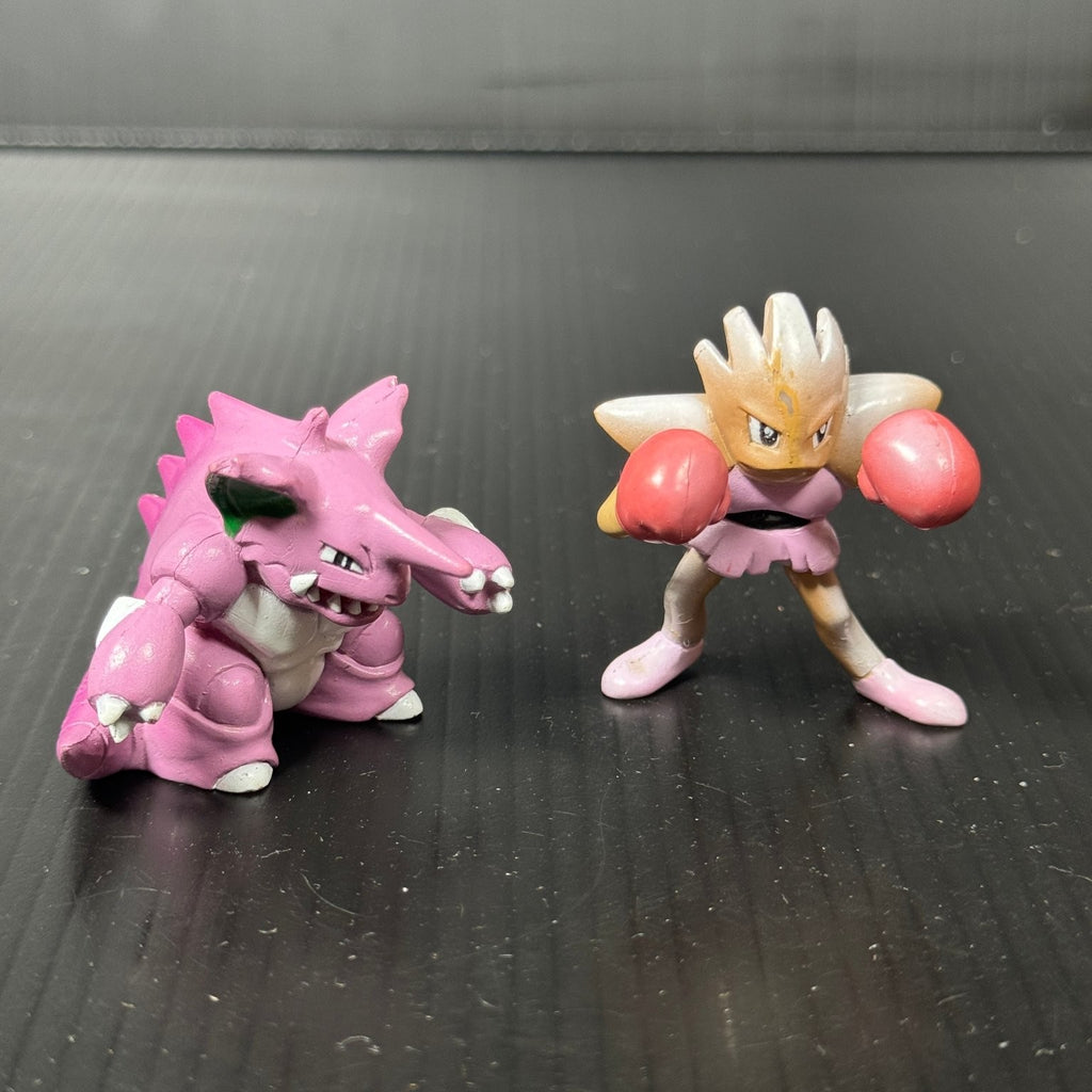 This vintage set features two classic Pokémon mini figures by Tomy, showcasing the beloved characters Hitmonchan and Nidoking. Each figure is crafted from durable plastic, with vibrant paint details that capture the unique traits of these iconic Pokémon from the original series. Hitmonchan is depicted in a fighting stance with red boxing gloves and a pink skirt, while Nidoking displays its distinctive spiked back and fierce expression in a crouched pose.