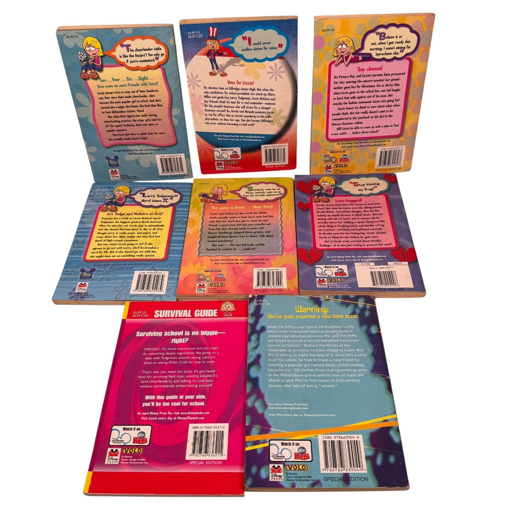 This charming collection features eight paperback books inspired by the hit Disney Channel TV series Lizzie McGuire and Phil of the Future. Published by Disney Press between 2002 and 2005, each book is a special edition that captures the spirit of the early 2000s Disney teen experience. Included titles are fan favorites like "The Rise and Fall of the Kate Empire," "Lizzie for President," "Picture This," "Totally Crushed!", "New Kid in School," "Broken Hearts," along with the "Lizzie McGuire Survival Guide: School" and "Phil of the Future: Stuck in Time."