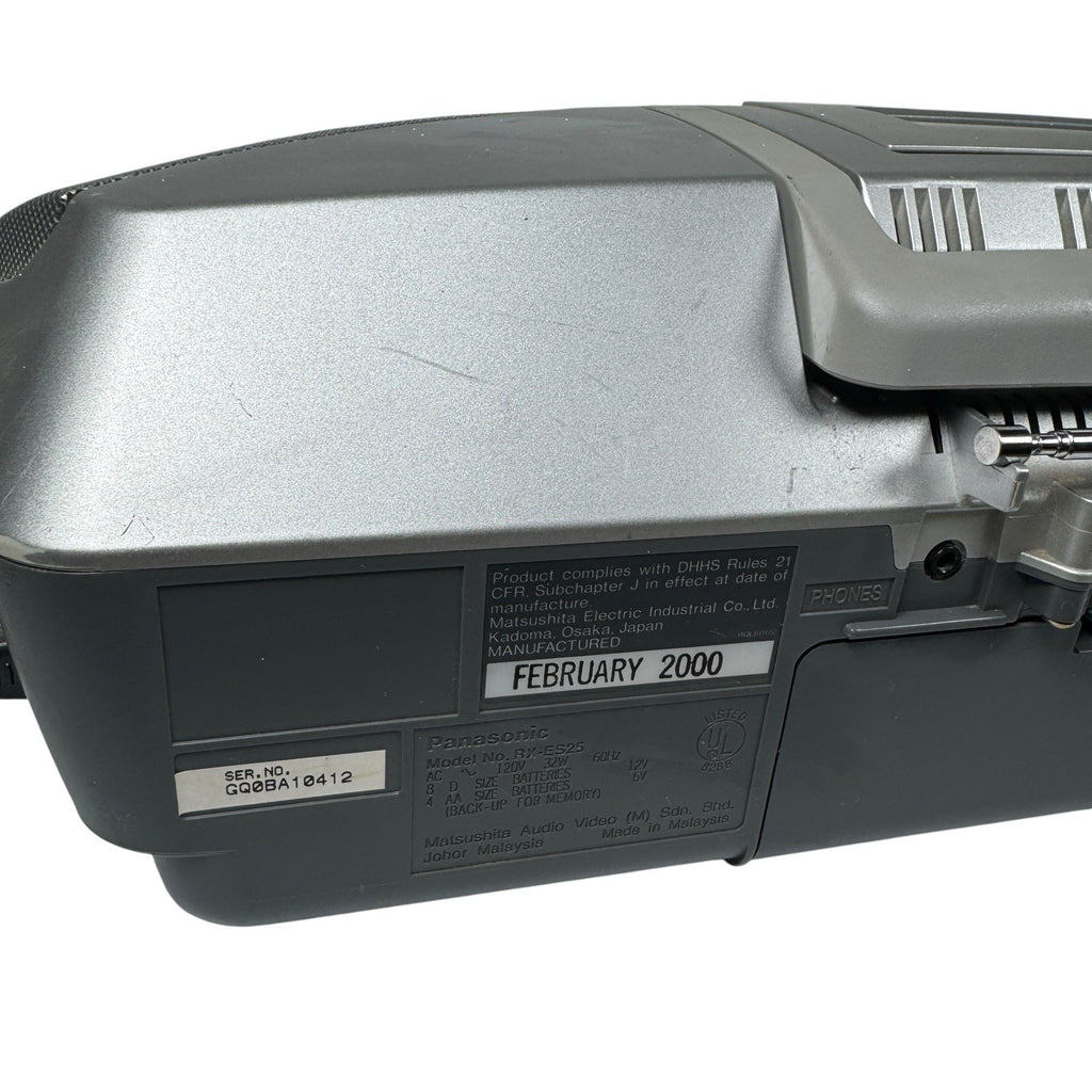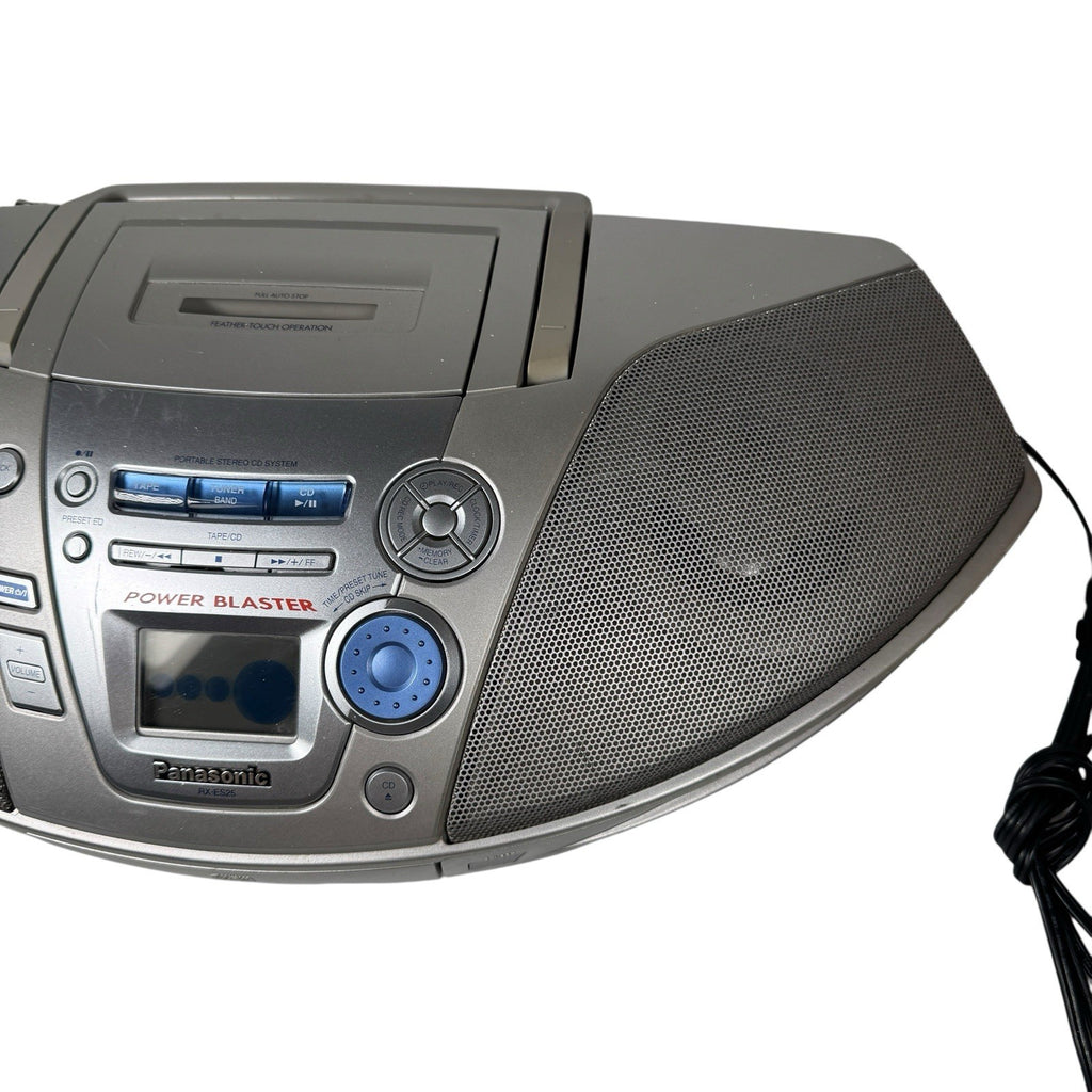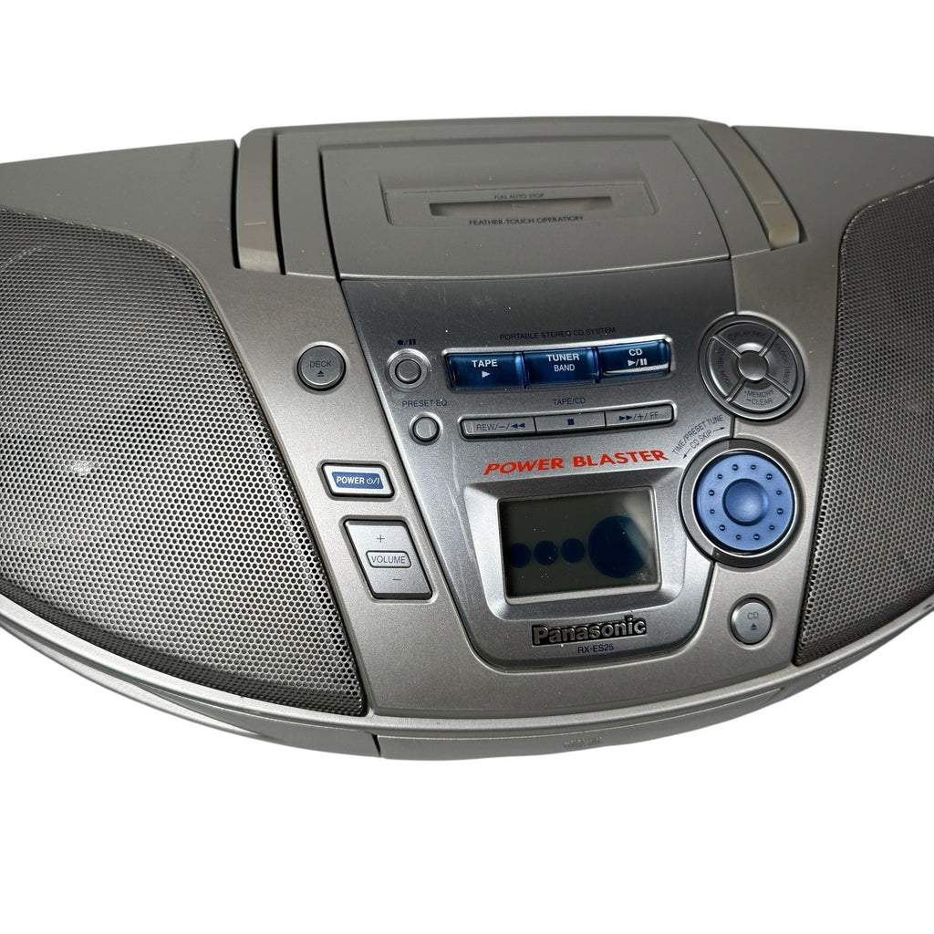 The Vintage Y2K Panasonic Power Blaster RX-ES20 Boombox is a sleek silver portable stereo system that combines the functionality of a CD player and a cassette tape player in one compact unit. This boombox, produced by Panasonic, features a single CD changer capacity and AM/FM radio capabilities. Perfect for those who appreciate retro technology and nostalgia, this boombox offers a unique blend of old-school charm and modern convenience for portable audio enjoyment.