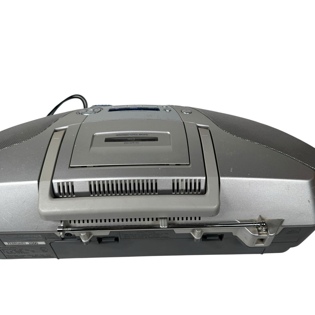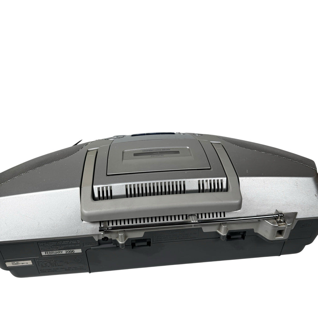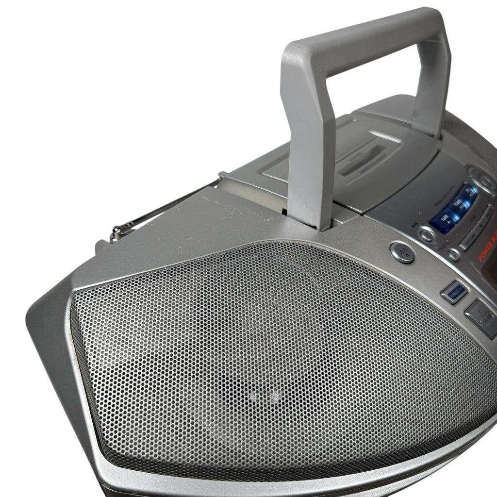 The Vintage Y2K Panasonic Power Blaster RX-ES20 Boombox is a sleek silver portable stereo system that combines the functionality of a CD player and a cassette tape player in one compact unit. This boombox, produced by Panasonic, features a single CD changer capacity and AM/FM radio capabilities. Perfect for those who appreciate retro technology and nostalgia, this boombox offers a unique blend of old-school charm and modern convenience for portable audio enjoyment.