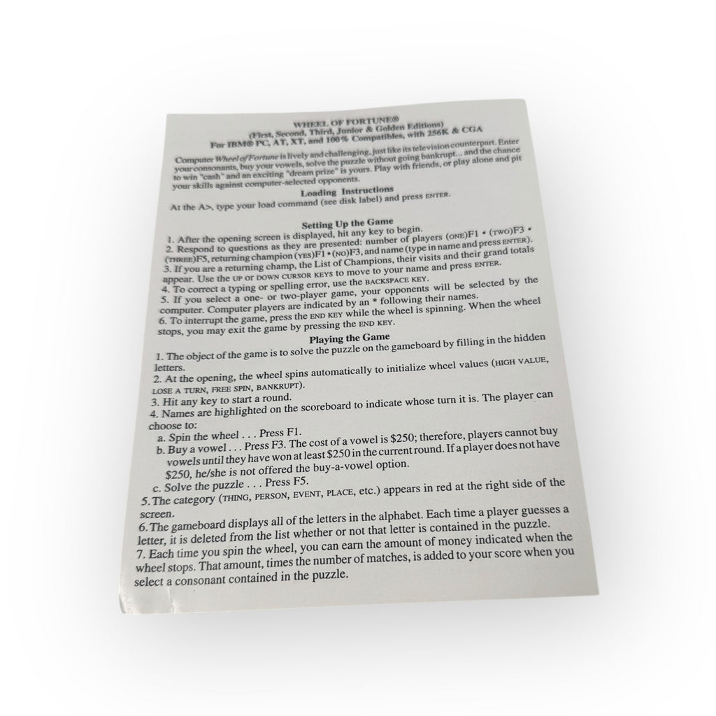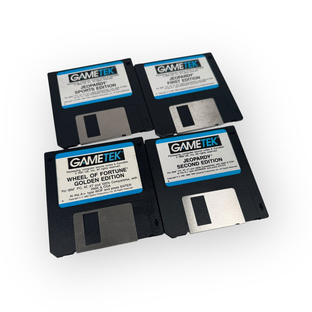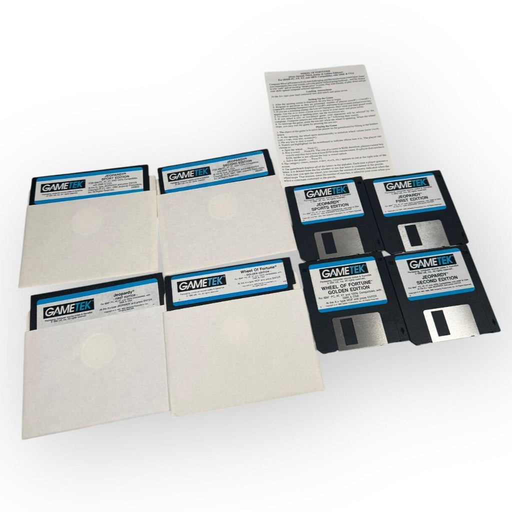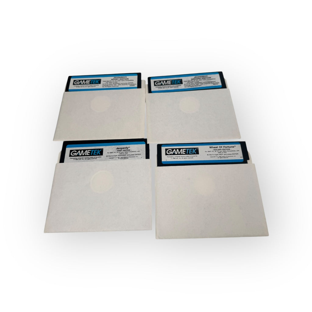 This is a vintage IBM PC game lot that includes three editions of Jeopardy! (first, second, and sports) and one edition of Wheel of Fortune (Gold). The games are suitable for everyone and were published by GameTek in 1987.Compatible with IBM PC, AT and XTThis product is in Good condition.