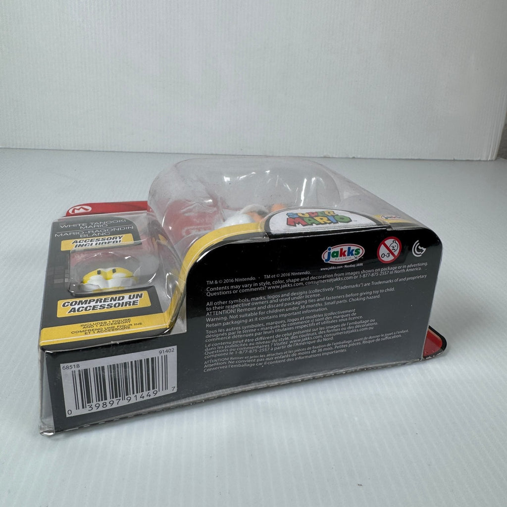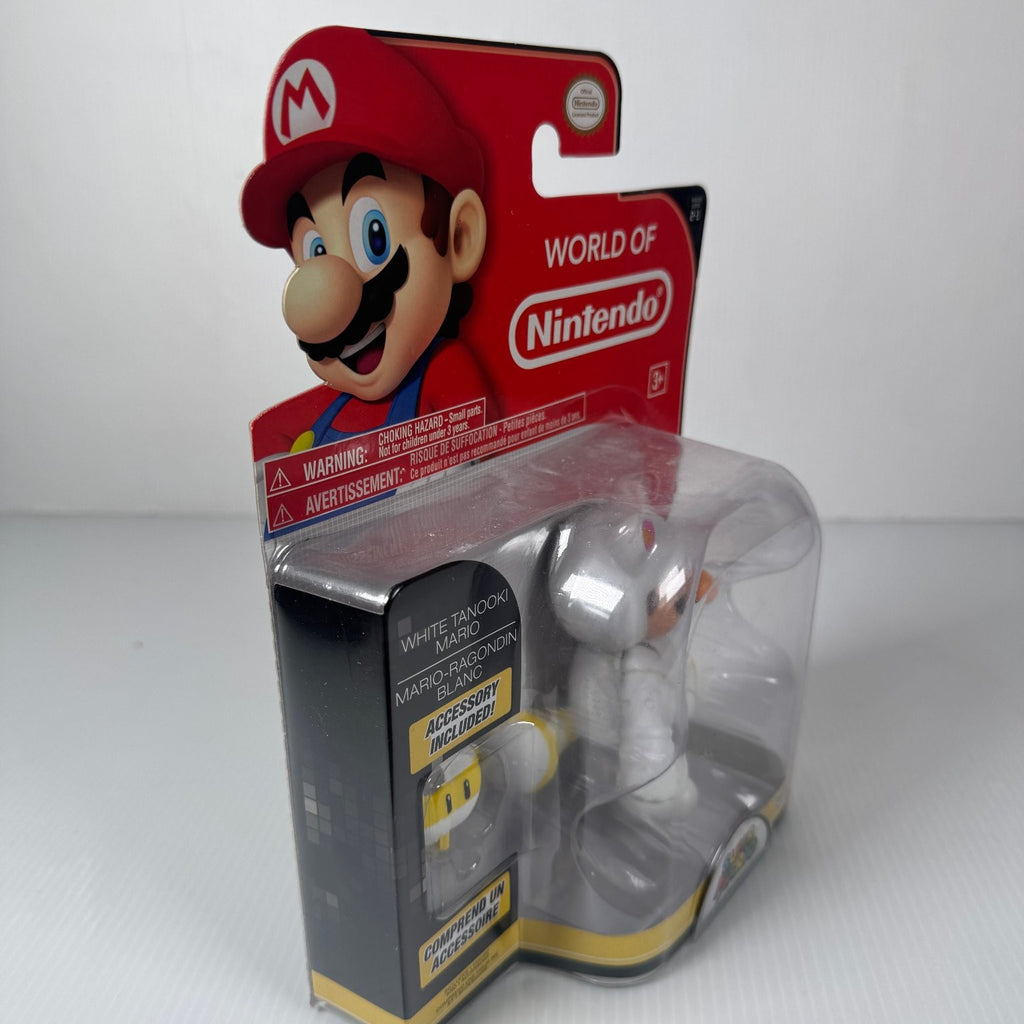 This World of Nintendo White Tanooki Mario action figure captures the iconic Super Mario character in his rare white Tanooki suit, complete with a yellow belly and a matching leaf accessory. Manufactured by Jakks Pacific in 2016, this officially licensed Nintendo collectible stands approximately 4 inches tall (11.16 cm) and is crafted from durable ABS plastic. It features 10 points of articulation, allowing for a wide range of poses and display options.