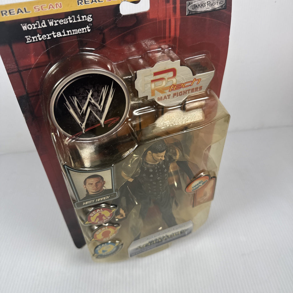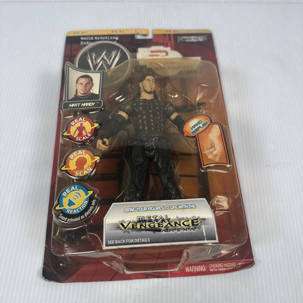 This wrestling figure is sealed in its original package. The cardback has wear from age and shelf wear including curing, corner wear, and wear to the bottom plastic. See photos for specific wear to the packaging.