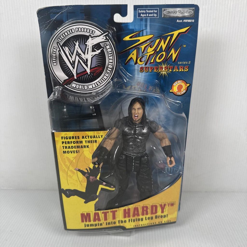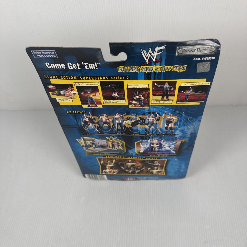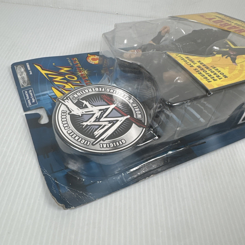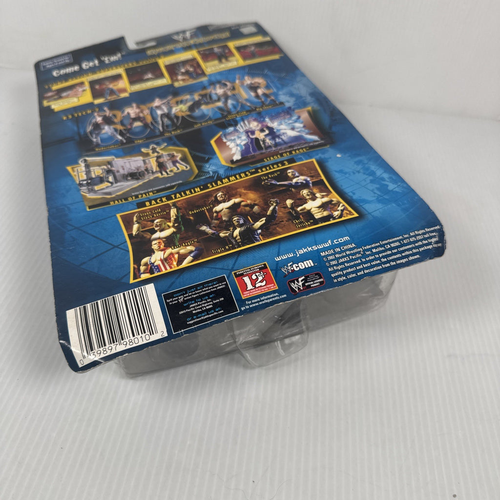 This wrestling figure is sealed in its original package. The cardback has wear from age and shelf wear including curing, corner wear, and wear to the bottom plastic. See photos for specific wear to the packaging.