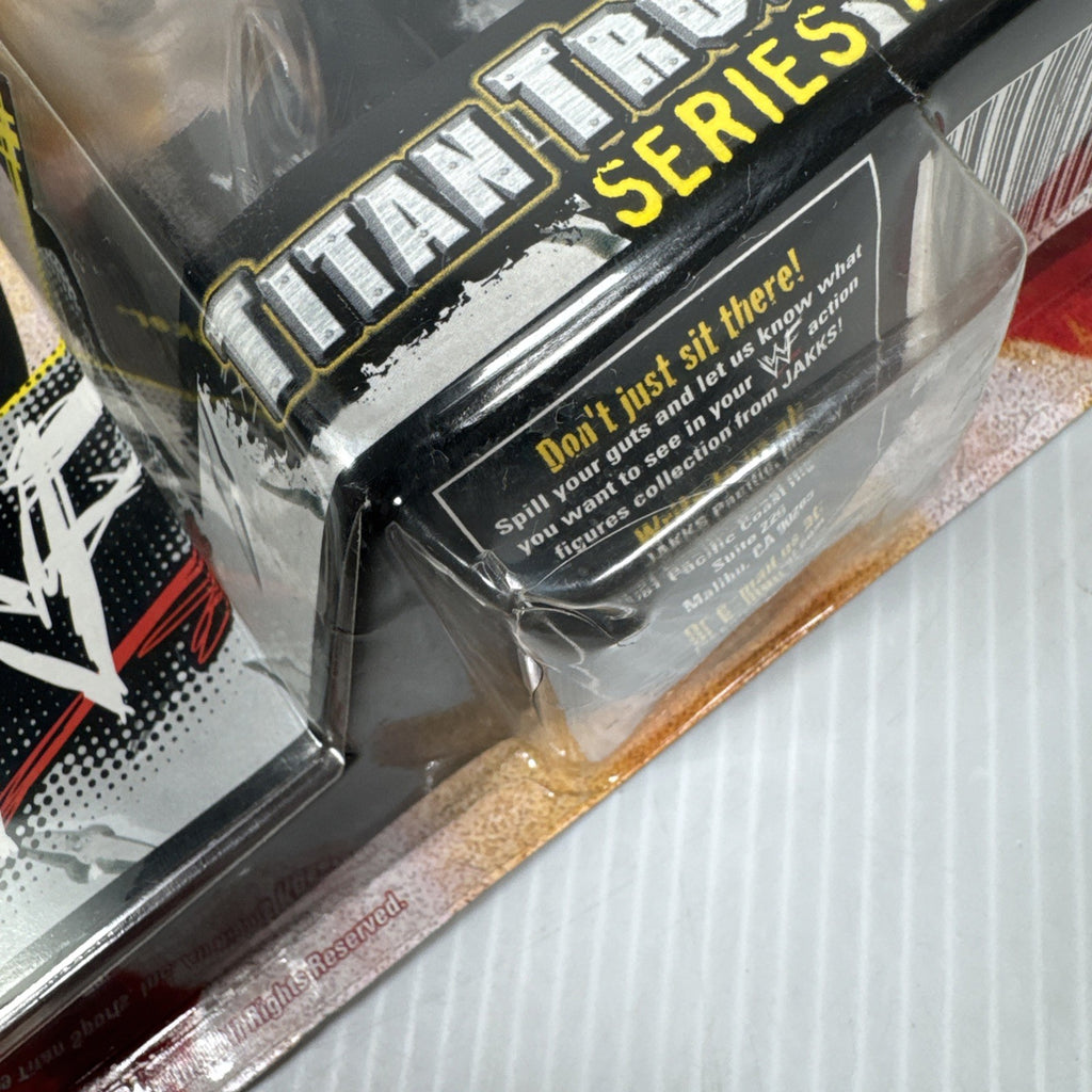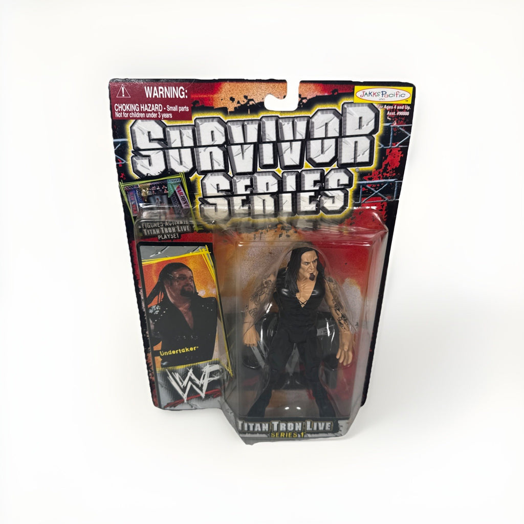 The product is a WWE action figure from the Survivor Series Titan Tron Live Series 1 featuring the character Undertaker. This collectible item is part of the WWE franchise and is designed to resemble the iconic wrestler, making it a must-have for fans of the brand. The figure captures Undertaker's essence in a dynamic pose, perfect for display or play, and is sure to be a valuable addition to any wrestling memorabilia collection.This product is in Used condition.