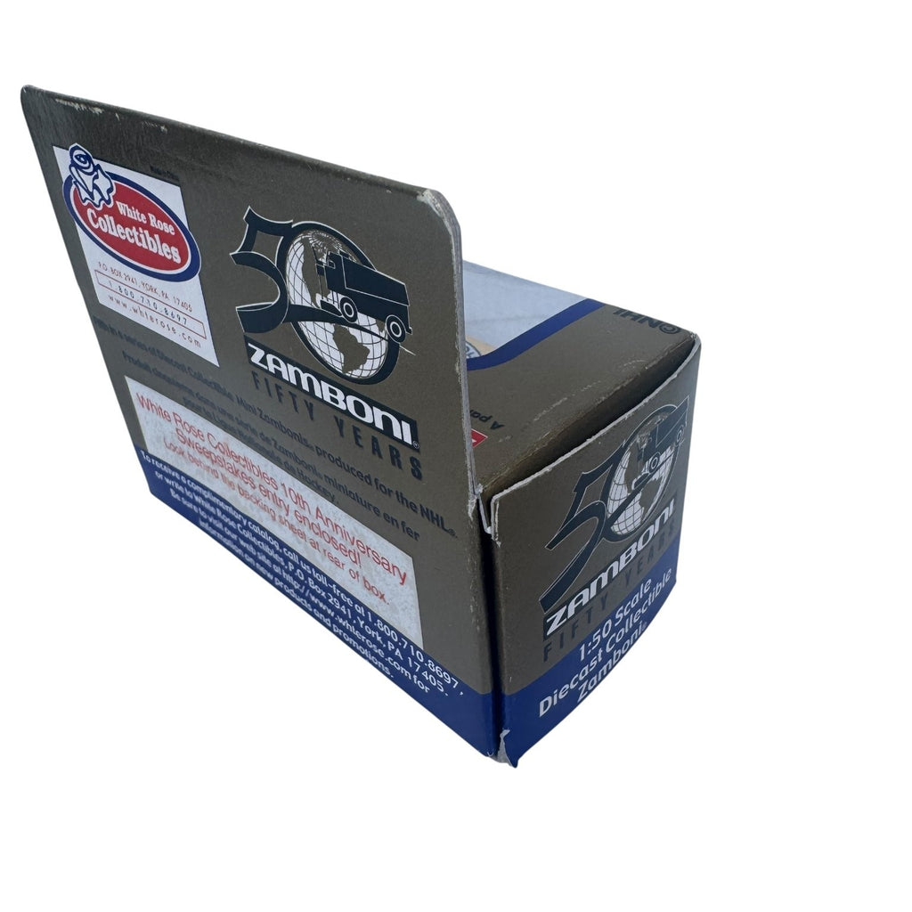 This compact collectible includes a miniature driver figure seated on the Zamboni, adding a realistic touch to the design. Packaged in its original branded box marked with NHL and Zamboni logos, the item highlights its status as an official licensed product. The packaging also notes a White Rose Collectibles 10th Anniversary Sweepstakes entry, adding extra collectible value. A perfect addition for fans and collectors alike, this Zamboni model combines nostalgic charm with quality craftsmanship.This product is in New condition.